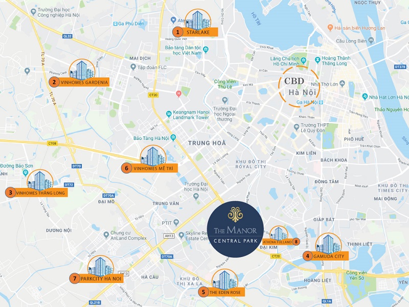Với diện tích gần 90ha nằm trên trục đường Nguyễn Xiển kéo dài, mặt tiền The Manor Central Park tiếp giáp với đường vành đai 3, mặt còn lại liền kề công viên Chu Văn An với diện tích lên tới 110ha. The Manor Central Park được tận hưởng các lợi ích hạ tầng từ việc hoàn thiện các tuyến đường lớn. Với vị trí tâm điểm phía Tây Hà Nội, cư dân The Manor Central Park trong tương lại có thể tận dụng tối đa ưu thế mạng lưới giao thông hoàn chỉnh, kết nối xuyên suốt đến tất cả các khu vực trung tâm của thành phố: Khi tuyến đường nghìn tỉ Nguyễn Xiển – Xa La đi vào hoạt động sẽ rút ngắn thời gian di chuyển từ dự án đến các khu vực trung tâm và cửa ngõ Thủ đô như Pháp Vân - Cầu Giẽ, Thường Tín… Từ đây, cư dân có thể dễ dàng di chuyển đến các địa điểm như bán đảo Linh Đàm, bến xe khách phía Nam, bệnh viện Bạch Mai, bệnh viện Việt Pháp, các trường đại học như Đại học Ngoại ngữ, Đại học KHXHNV, Đại học Bách Khoa, Đại học Kinh tế Quốc dân...