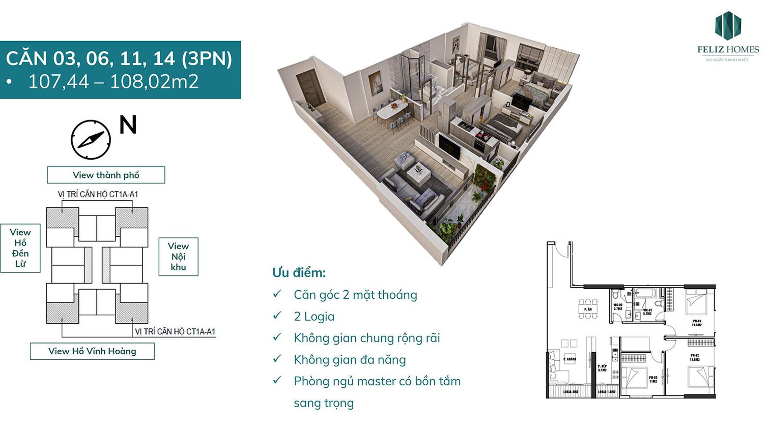 Tất cả đều là căn góc, sở hữu mặt bằng căn hộ vuông vắn, tối đa hóa công năng sử dụng và trên hết, 50% căn hộ có 2 đến 3 mặt thoáng với tầm view rộng mở. Hơn nữa, các căn hộ tại Chung cư Panorama Hà Nội có thiết kế tối khi vừa có logia phơi đồ kín để giữ cảnh quan chung của cả tòa nhà lại vừa có ban công đáp ứng sở thích của khách hàng.