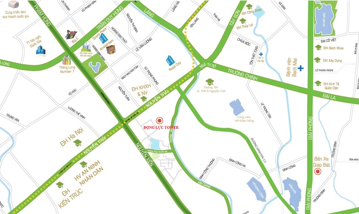 Đây là mảnh đất không chỉ có ý nghĩa lớn về mặt phong thủy (thế đất với sự mát mẻ, cao ráo, xanh tươi, hưng thịnh) mà còn có giá đất cao nhất nhì thủ đô hiện nay. Trục Nguyễn Trãi là tuyến đường huyết mạch kết nối phía Tây Nam thủ đô, có cơ sở hạ tầng rất phát triển, hệ thống giao thông thuận lợi (đường vành đai, hệ thống đường sắt trên cao, hầm đường bộ). Chung cư Động Lực Tower còn nằm gần đường vành đai 3, tuyến đường cao tốc trên cao di chuyển đi các tỉnh khác rất nhanh chóng.