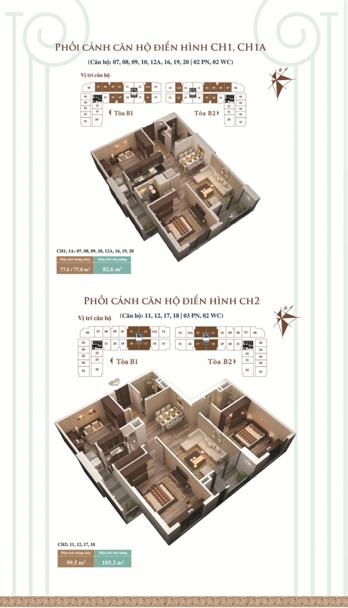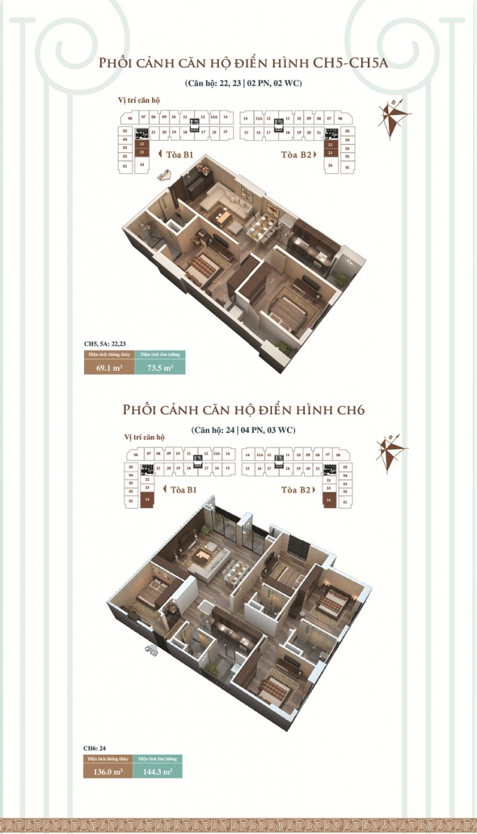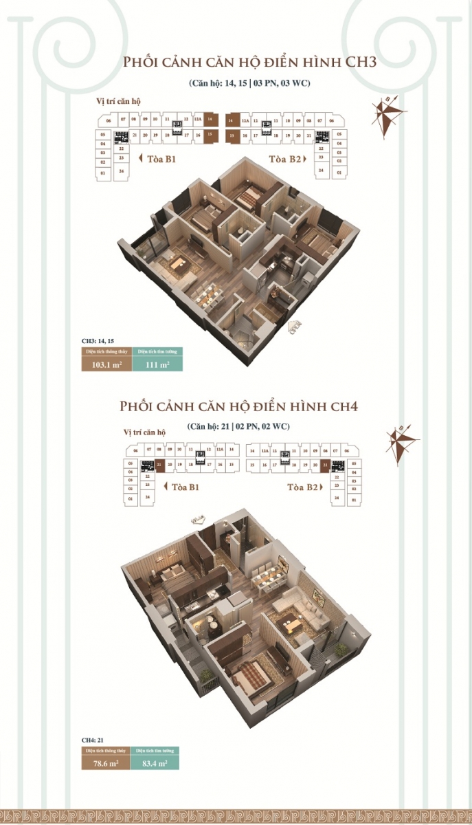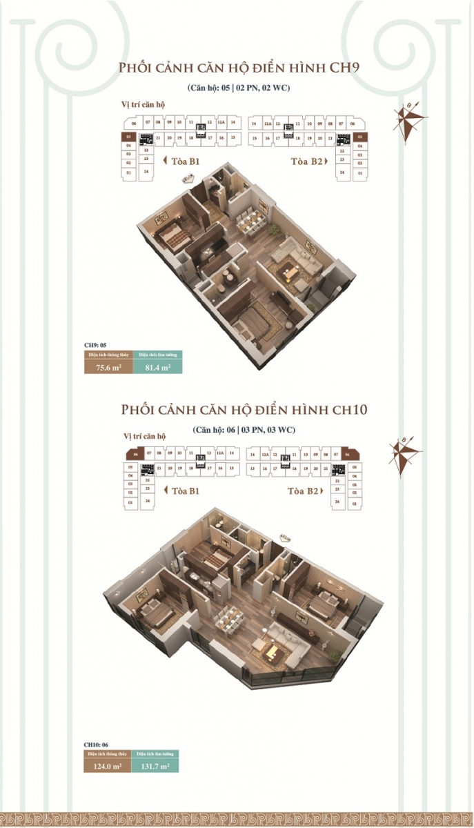 Các căn hộ có diện tích linh hoạt từ 68m2 – 138m2, được bố trí 2 logia thoáng đón nắng/gió tự nhiên. Phong cách Tân cổ điển Châu Âu là điểm nhấn ấn tượng mang đến nét tinh tế, đơn giản mà đầy sang trọng trong từng đường nét thiết kế căn hộ.