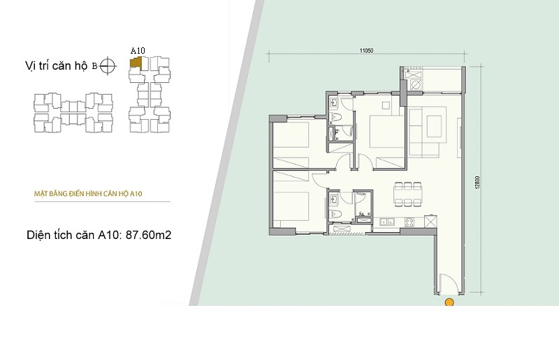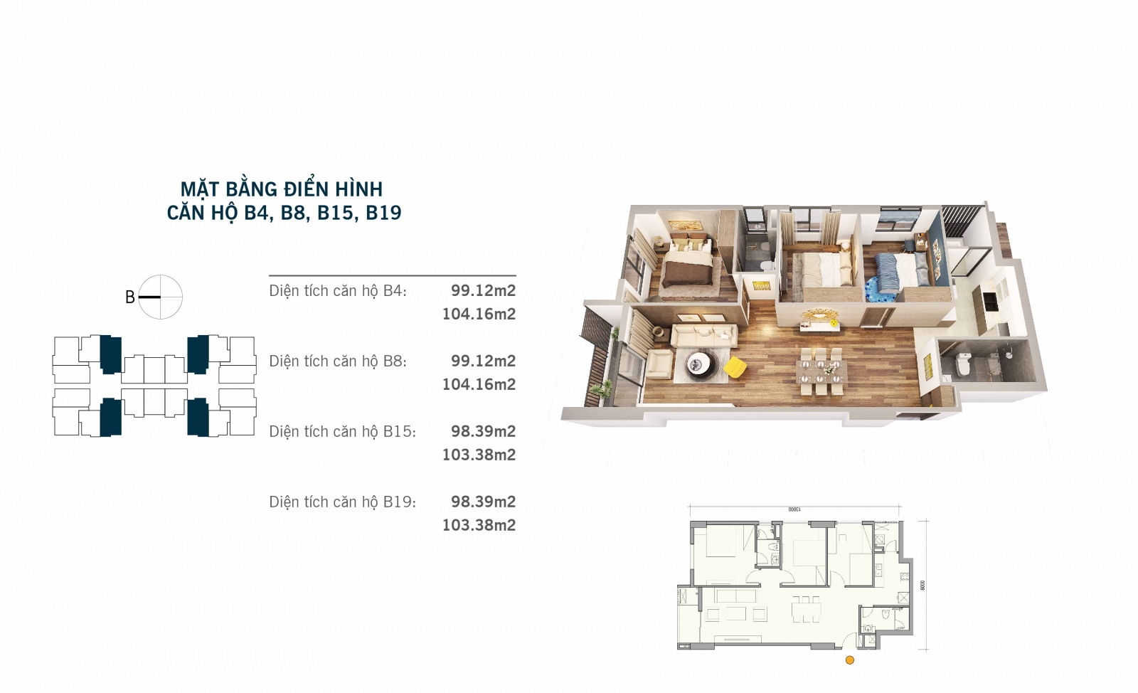 Căn loại 3 P N: 85,8m2 – 105,2m2.