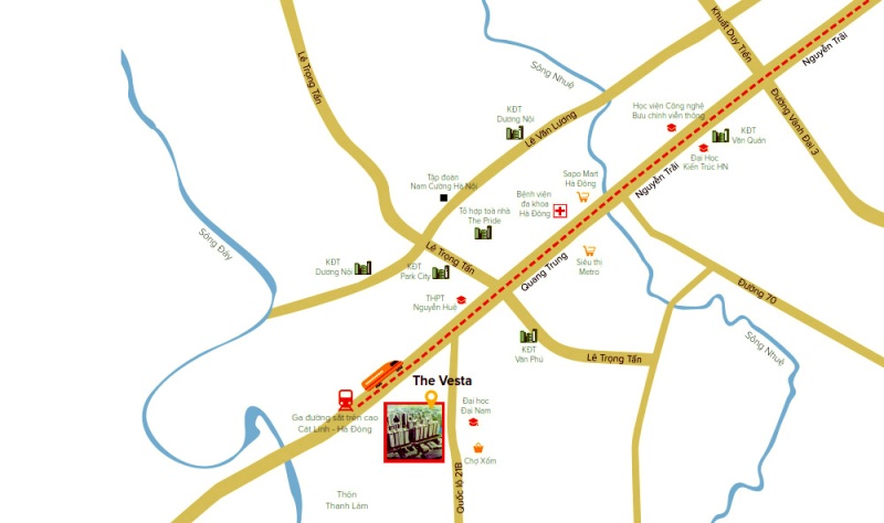 Tọa lạc tại trung tâm quận Hà Đông, nằm trên trục đường chính Ba La, nơi giao thoa nhiều tuyến đường quan trọng của trục kinh tế Bắc Nam và đặc biệt là tuyến đường sắt trên cao Cát Linh Hà Đông, rút ngắn quãng đường di chuyển vào trung tâm Hà Nội xuống chỉ còn 15 phút. Điều đặc biệt, chúng tôi đã nỗ lực hết mình để xây dựng mảnh đất này thành một không gian xanh- sống trong lành, gửi cư dân sự nâng tầm cuộc sống.
