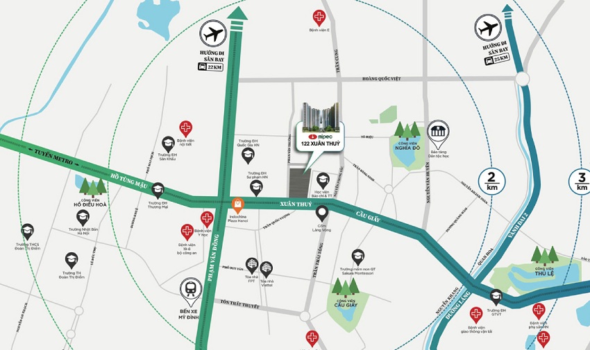 Cùng với đó, chỉ trong vòng bán kính 1km, hàng loạt các công trình hạ tầng xã hội hàng đầu (hệ thống trường nhiều cấp chất lượng cao Đoàn Thị Điểm, Marie Curie, Lê Quý Đôn, Trường chuyên Đại học Quốc Gia, Bệnh viện 198- Bộ Công An, Bệnh viện Huyết học và Truyền máu TW, công viên Cầu Giấy, công viên Hòa Bình…) là những “điểm Vàng” trong quyết định lựa chọn Chung cư Mipec Xuân Thủy làm một chốn an cư đẳng cấp.