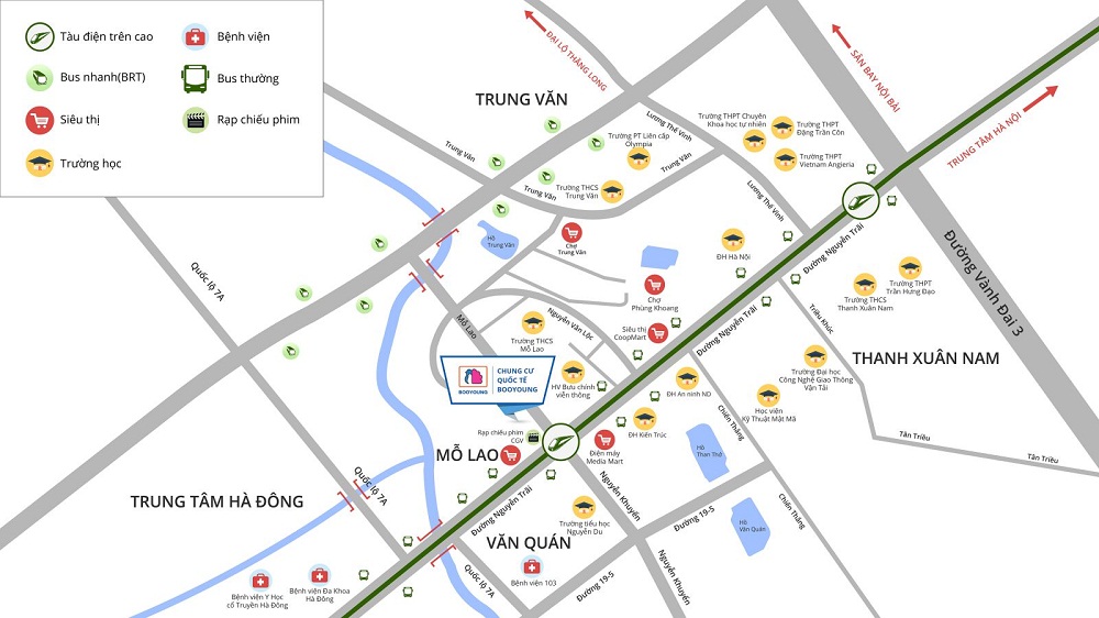 Chung cư Booyoung Vina kết nối giao thông thuận tiện bằng các tuyến đường lớn như: đường Trần Phú, đường Nguyễn Trãi, đường Khuất Duy Tiến, đường Tố Hữu, đường Lê Văn Lương, đường Thanh Bình…