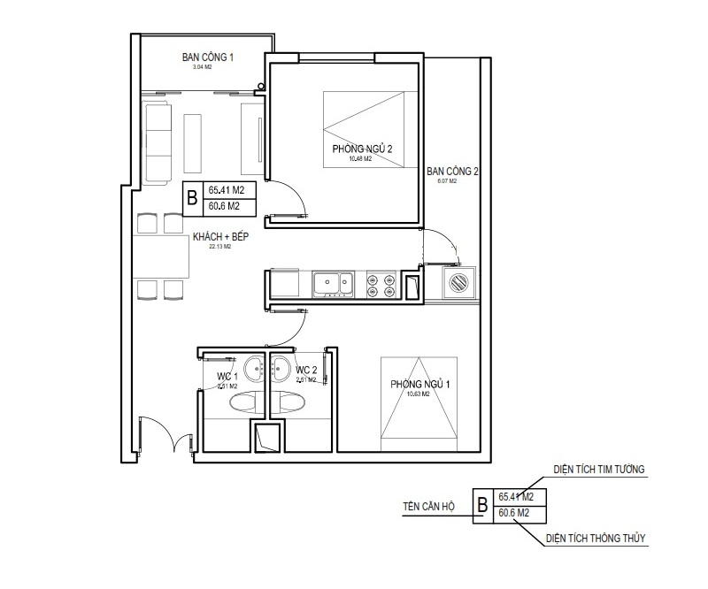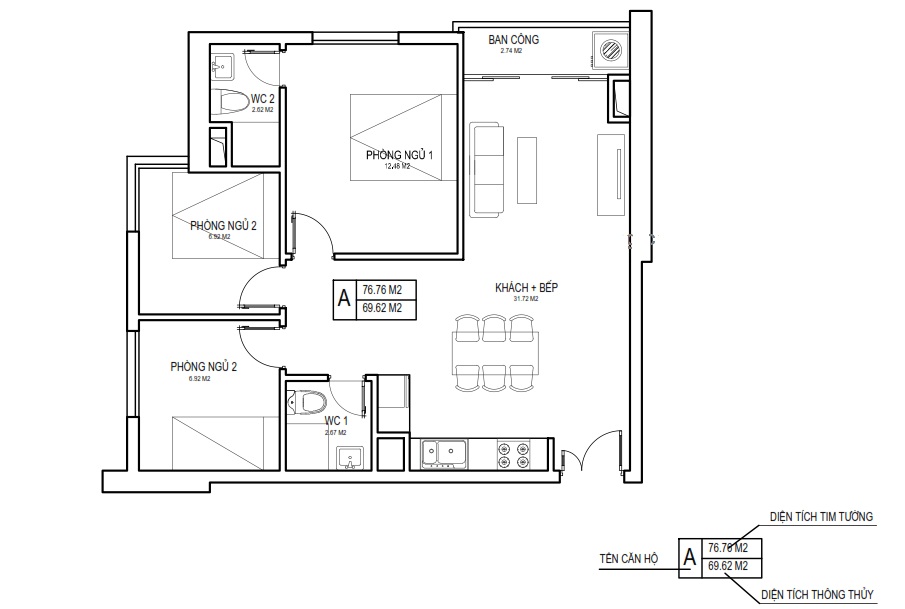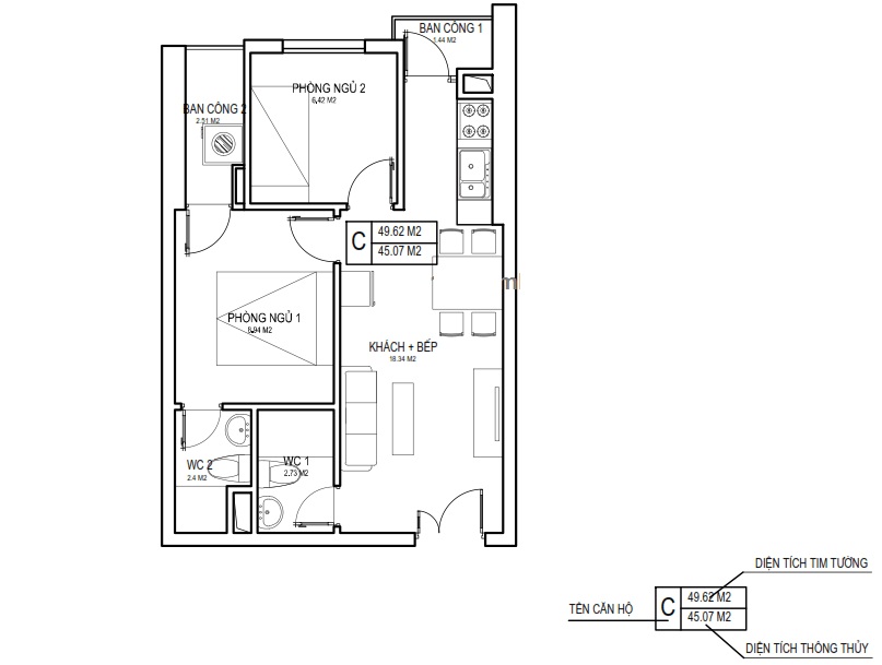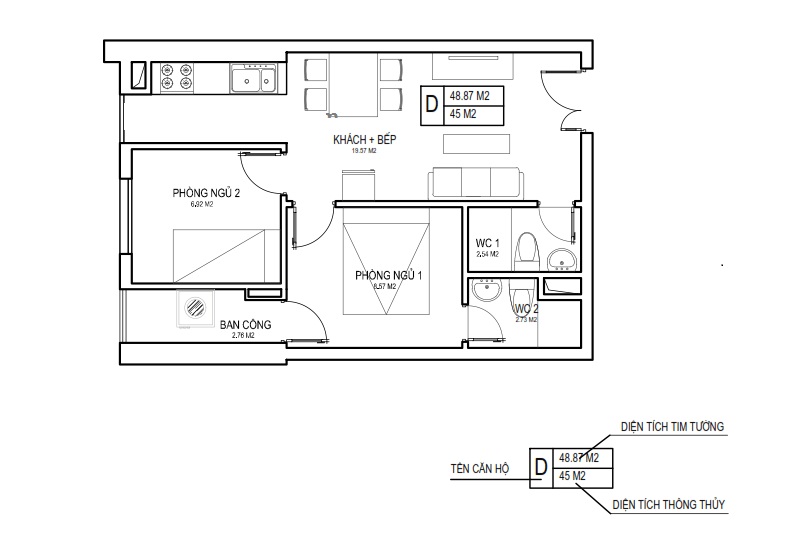 Diện tích thông thủy: 45.91m2 – 47.93m2 – 58.96m2 - 76.28m2