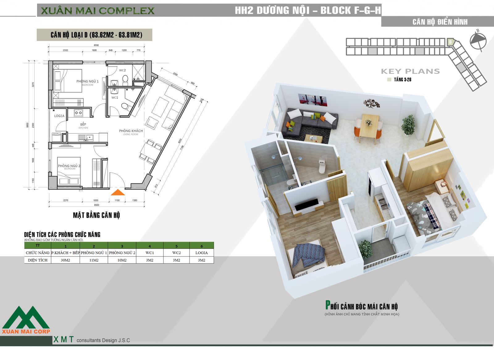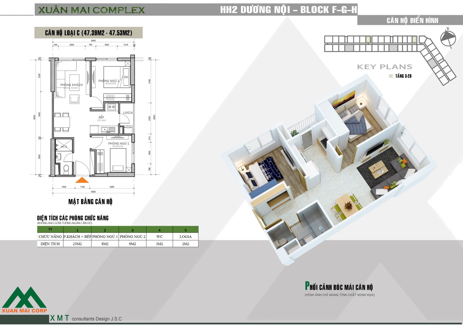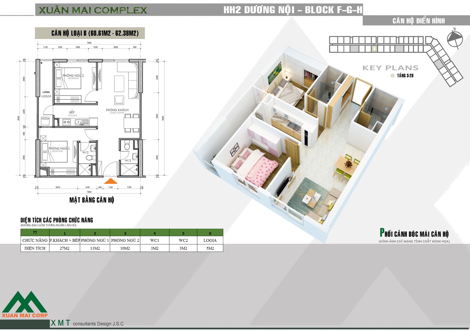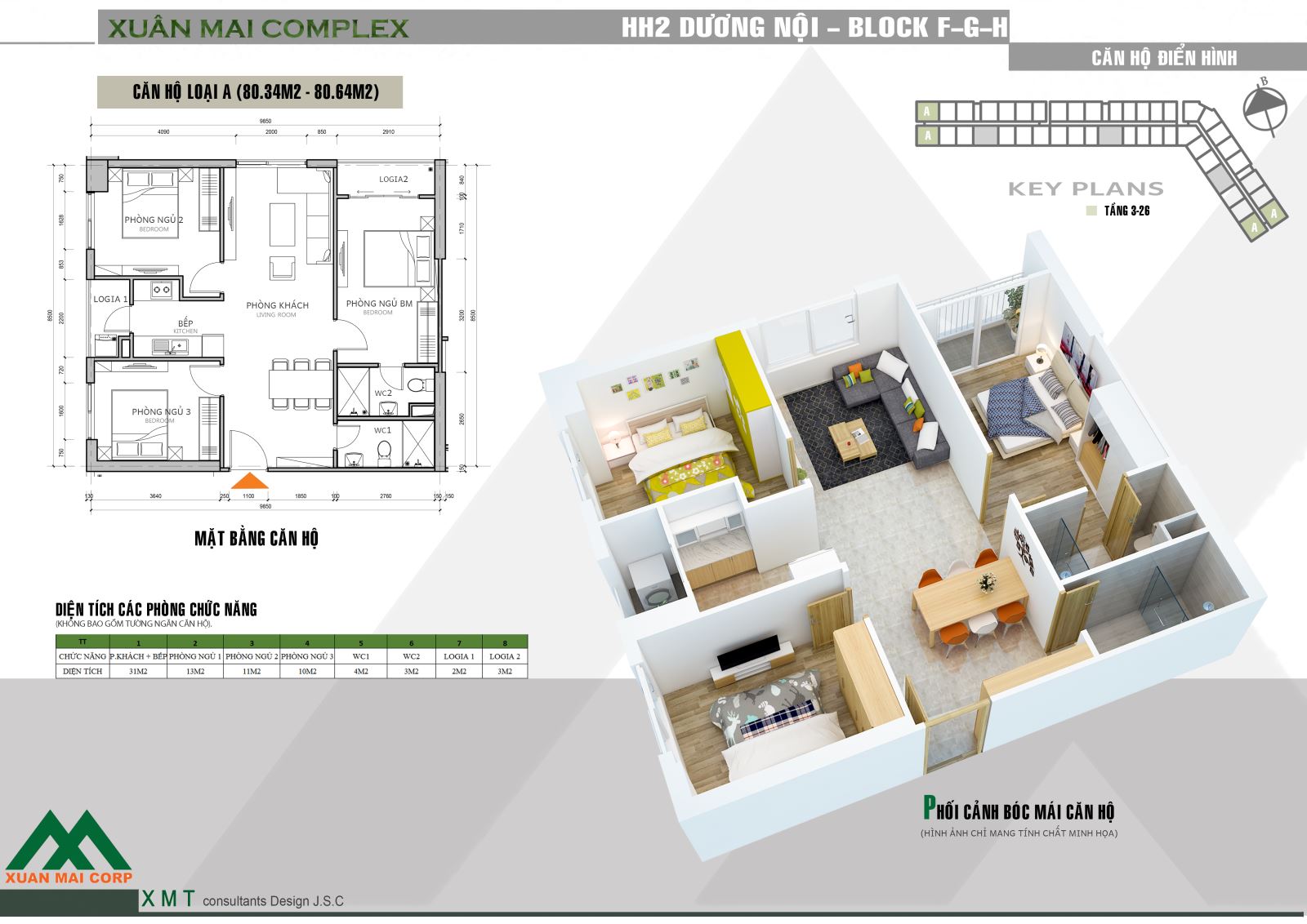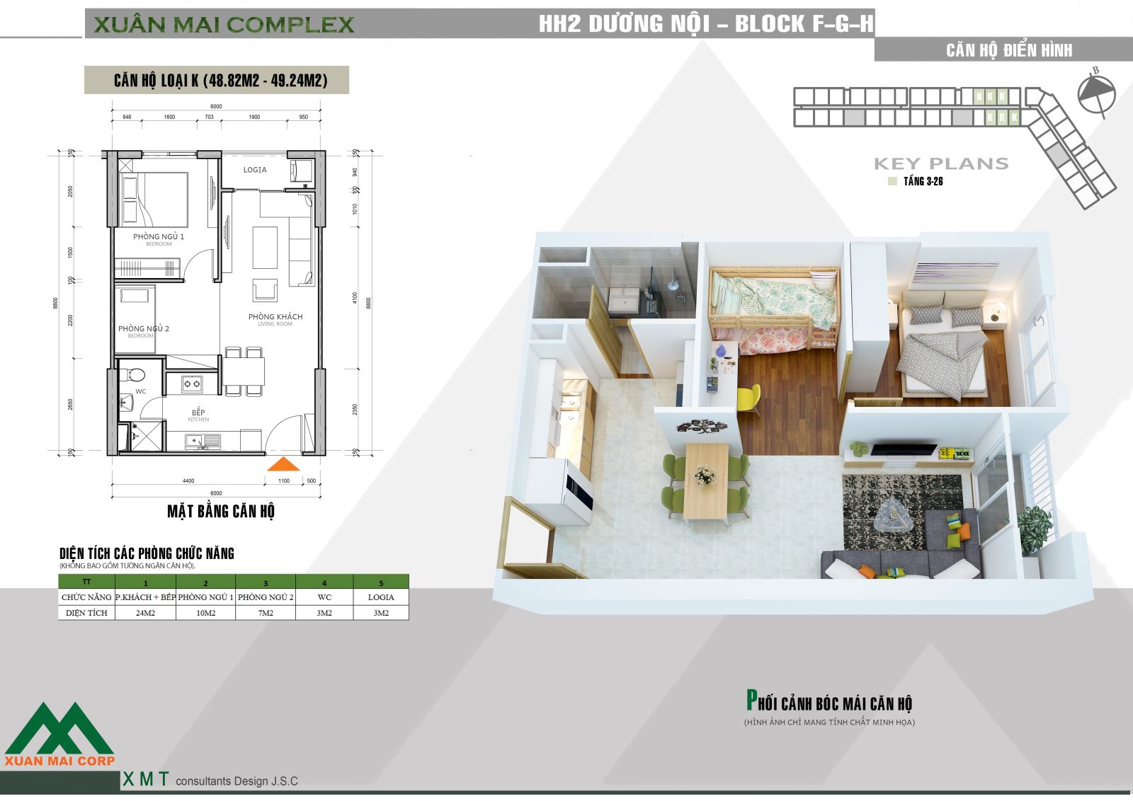 Các căn hộ tại Xuân Mai Complex có diện tích linh hoạt từ 47,3m2 đến 80,42m2, bố trí từ 2 đến 3 phòng ngủ, đặc biệt phù hợp với các gia đình trẻ. Thiết kế khoa học, hiện đại, tối ưu hóa công năng sử dụng của từng phòng và tận dụng tối đa cửa sổ, ô thoáng giúp không gian trong phòng luôn thông thoáng, ngập tràn ánh sáng, nắng, gió tự nhiên.