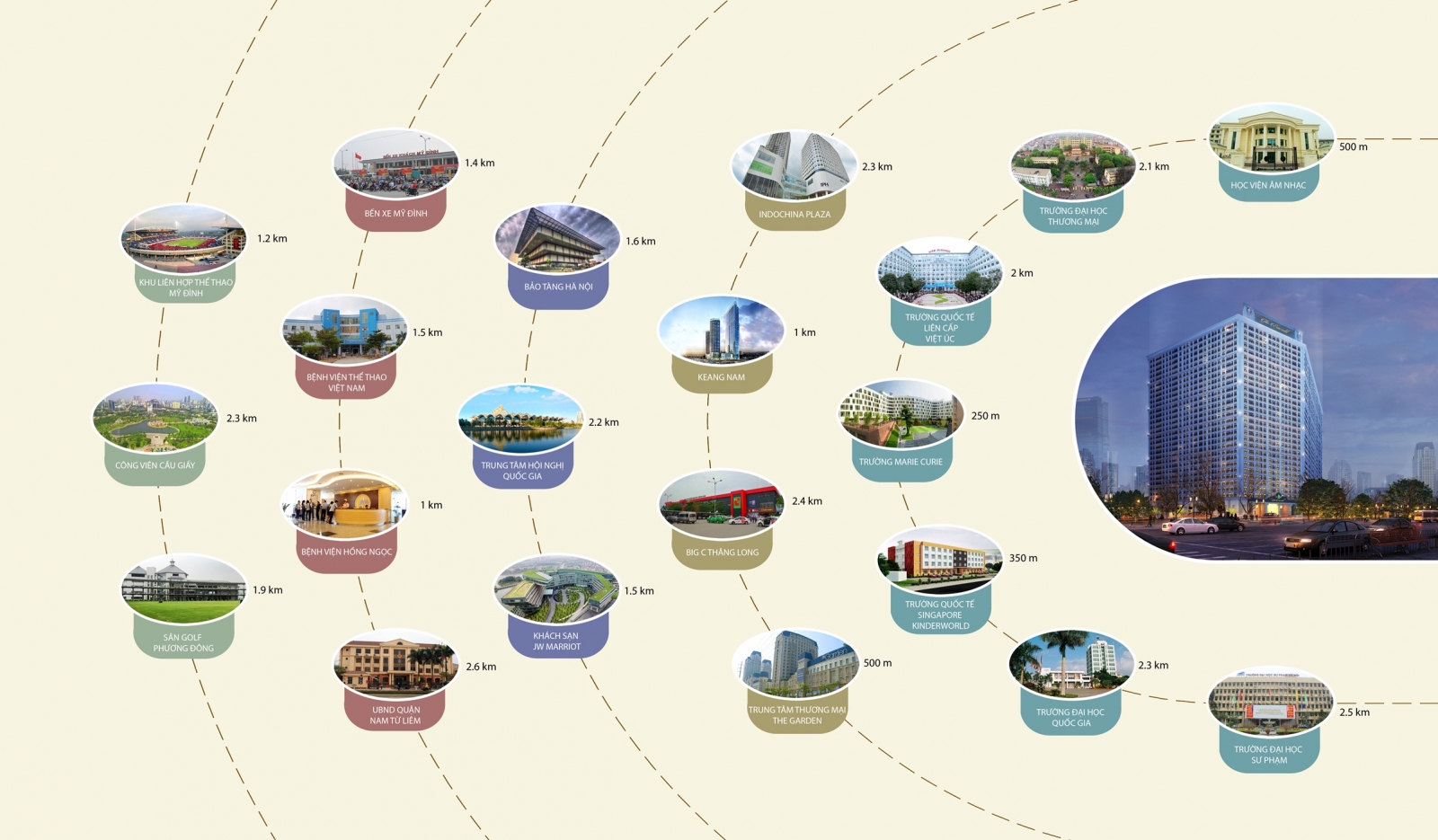 Đây cũng là vị trí gần với nhiều trường nổi tiếng như: Lomonoxop, Đoàn Thị Điểm, ngay cạnh trường Marie Curie, học viện âm nhạc quốc gia… Bên cạnh đó là rất gần với khu Liên hợp thể thao Mỹ Đình. Bạn có thể lựa chọn cho mình không gian vui chơi thể thao thoải mái, đa dạng và rất tiện lợi. Ngoài ra The Emerald Mỹ Đình còn khá gần:. Bệnh viện 198, Viện huyết học, tòa nhà KeangNam, tòa nhà sông Đà, big C Thăng Long, Lotte Cinema Landmark, khách sạn Jw Marriot,… Với vị trí thuận lợi như vậy mang lại lợi thế cho The Emerald. Đem tới cuộc sống tiện ích và được phục vụ đầy đủ cho cư dân trong sinh hoạt.