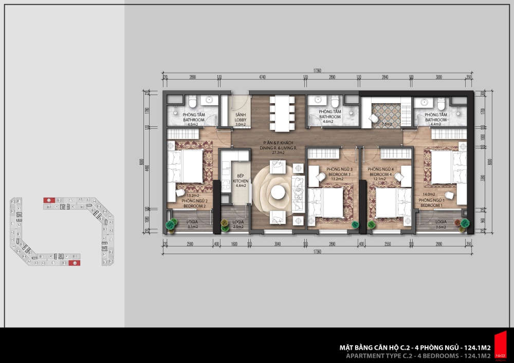 - Căn hộ 4 phòng ngủ: 125 – 142m2