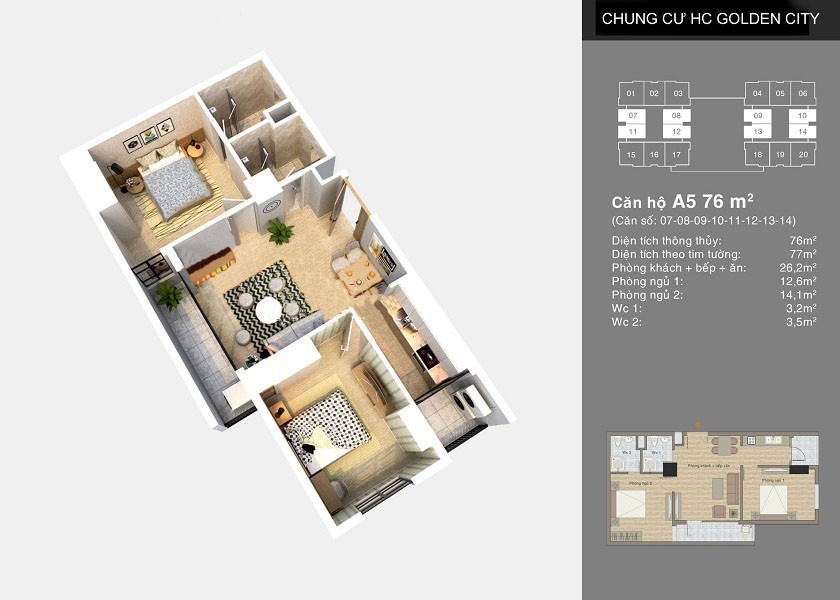 Với 8 loại hình căn hộ khác nhau, Dự án HC Golden City Long Biên cung cấp cho thị trường số lượng căn hộ đa dạng từ 65 m2 – 91 m2 – 128 m2. Căn hộ thiết kế hiện đại 2 – 3 phòng ngủ phù hợp với nhu cầu sử dụng của nhiều hộ gia đình.