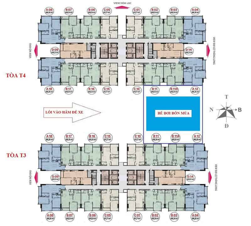 - Phía Tây: Giáp công viên cây xanh và bể bơi ngoài trời, hướng view tổ hợp nhà ở, văn phòng và thương mại dịch vụ tòa T4, T5 Thăng Long Victory