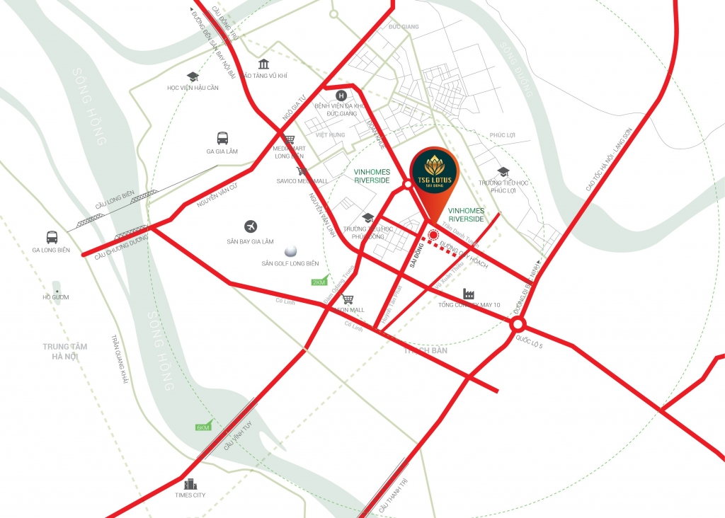 TSG Lotus Sai Dong nằm tại khu vực giao thông thuận lợi, kết nối điểm đầu cao tốc Hà Nội đi Hải Phòng, Quảng Ninh, tiệm cận nút giao thông Quốc lộ 5. Chỉ 10 phút di chuyển vào trung tâm thành phố qua các cây cầu Vĩnh Tuy, Thanh Trì, Long Biên. TSG Lotus Sai Dong thụ hưởng các tiện ích trọng yếu của quận như: trung tâm thương mại AEON Mall, sân golf Long Biên.