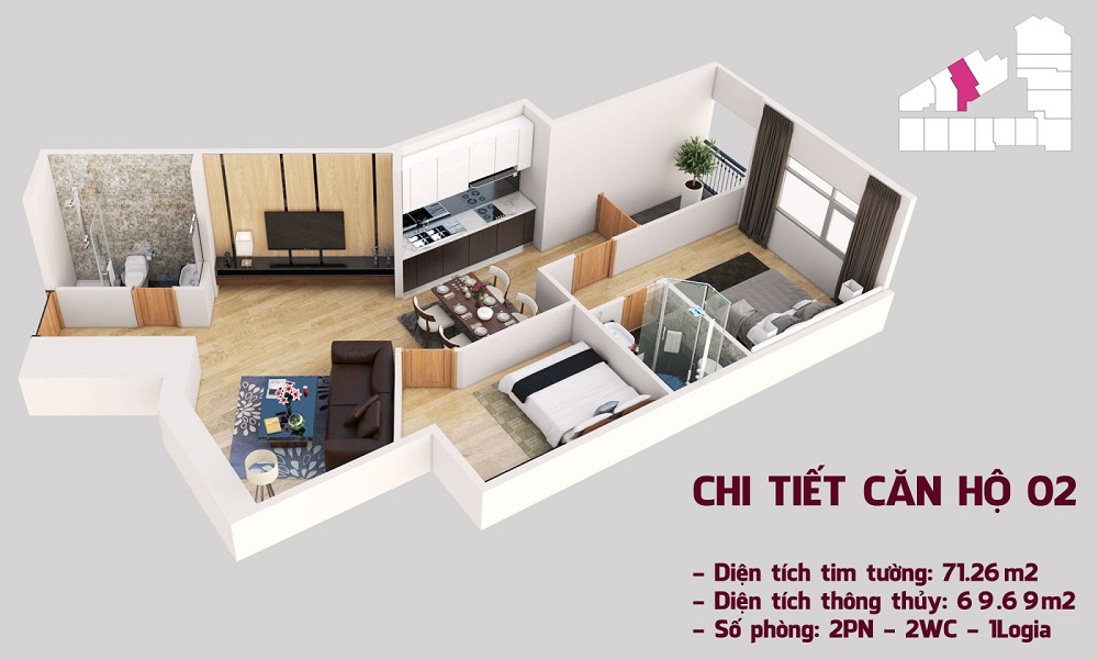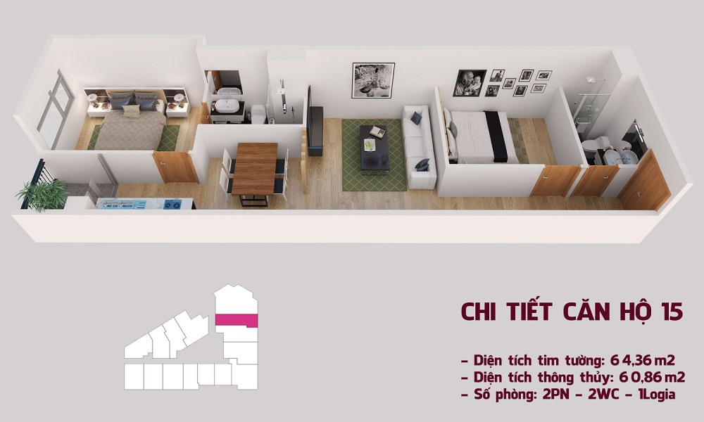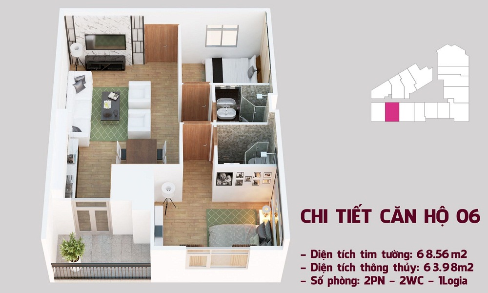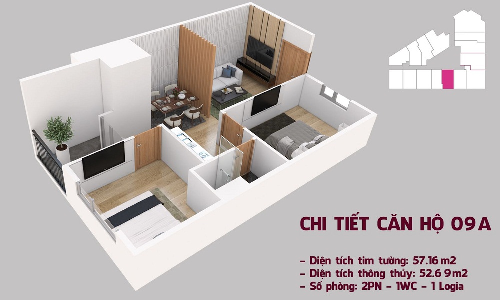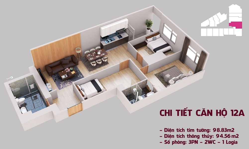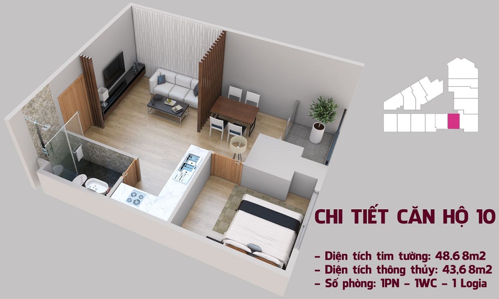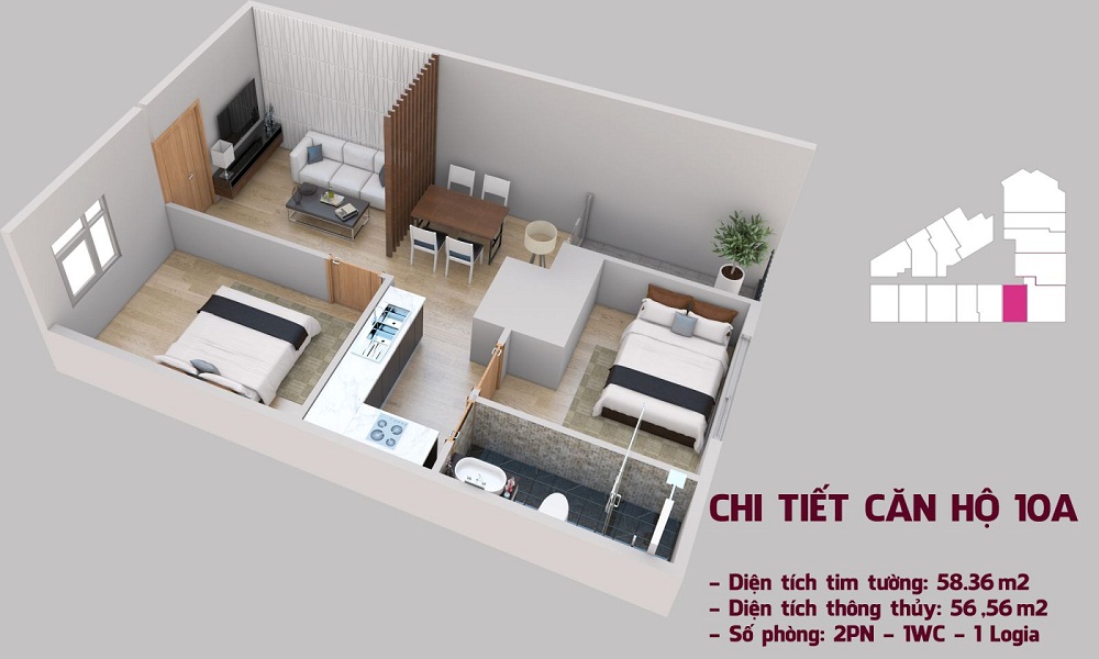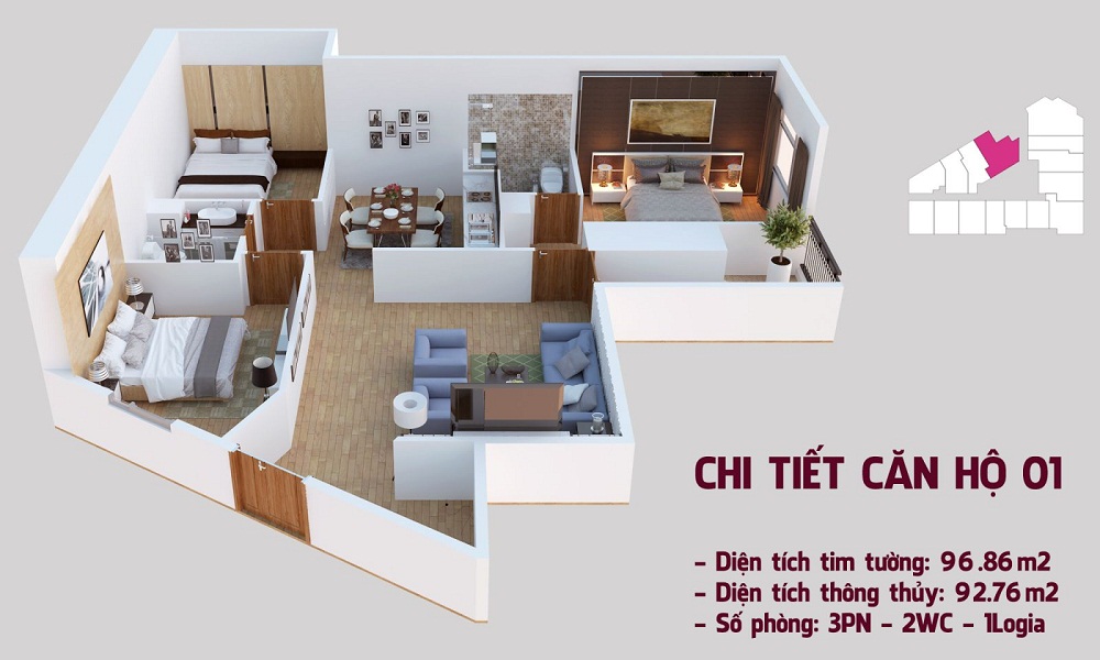 Diện tích căn hộ: 48,68m2, 50,16m2, 63m2,70.16m2, 83,36m2, 95 m2, 100m2 và 135 m2, 142m2