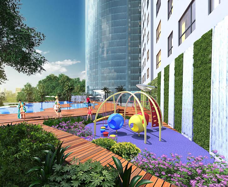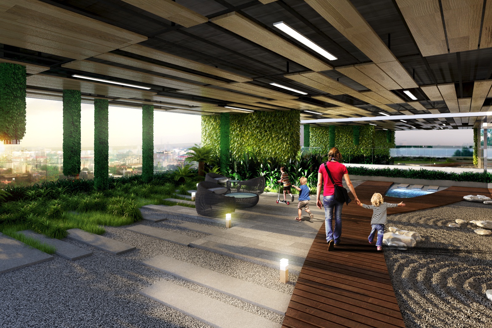 Vườn treo 2 được thiết kế bên khu vực chung cư để tăng tiện ích cho cư dân sinh sống với đài phun nước, lối đi bộ, chạy bộ và các khu vực tiện ích khác cho cư dân. Trên tầng tượng của tòa nhà cũng được thiết kế một khu vườn sinh thái thư giãn kiểu Nhật. Theo đó, một vườn treo nối giữa 2 tòa tháp, giúp phủ xanh tầm nhìn của cư dân dù ở bất kỳ đâu trong tòa nhà.