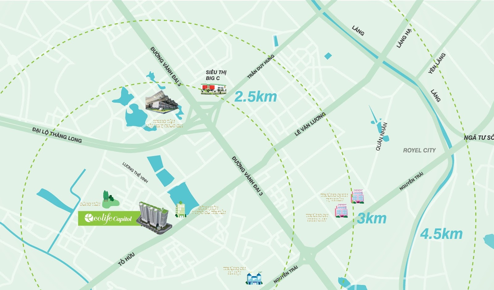 Chung cư Ecolife Capitol được bao quanh bởi các khu đô thị mới Phùng Khoang, Trung Văn và khu nhà ở Đài phát thanh – phát sóng Mễ Trì, hứa hẹn sẽ tạo nên một cộng đồng dân cư văn minh, hiện đại. Hơn thế, dự án còn là nơi giao thoa của các tuyến đường huyết mạch như: Khuất Duy Tiến, Trần Duy Hưng, Lê Văn Lương kéo dài, Nguyễn Trãi,…nên hệ thống giao thông nơi đây khá thuận lợi, từ đây cư dân có thể dễ dàng di chuyển vào trung tâm thành phố, khu vui chơi giải trí, mua sắm, các bệnh viện lớn cũng như bến xe, bến tàu,…