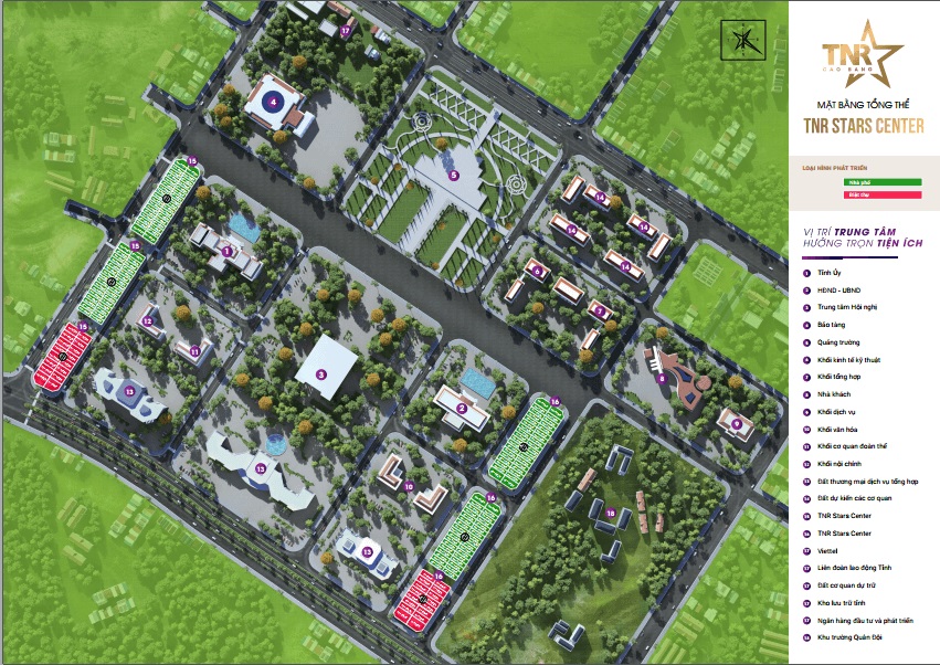 Dự án TNR Star Center được quy hoạch dựa trên cấu trúc truyền thống và lâu đời của vùng đất Cao Bằng bao quanh bởi màu xanh và núi đồi. Là khu đô thị: Hiện đại – Đồng bộ - Sinh thái – Cao tầng – Đa chức năng”. Sự khác biệt và độc đáo của dự án so với các dự án khác chính là xây dựng hình ảnh khu đô thị sinh thái, với diện tích cây xanh và mặt nước rất lớn trong khi mật độ xây dụng lại thấp. Đây chính là xu hướng sống mới trên thế giới và bắt nhịp với nhu cầu thực tế của Việt Nam.