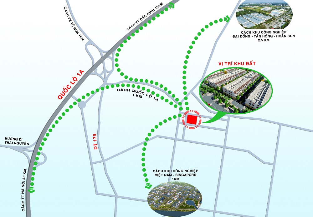 Dự án DTA Garden House Từ Sơn Bắc Ninh tọa lạc tại vị trí “vàng” Khu công nghiệp VSIP Từ Sơn Bắc Ninh, nút giao của 3 Khu công nghiệp lớn: VSIP Bắc Ninh, Đại Đồng – Hoàn Sơn, Tiên Sơn, tiềm năng giao thương phát triển kinh doanh dịch vụ, văn hoá lơn.