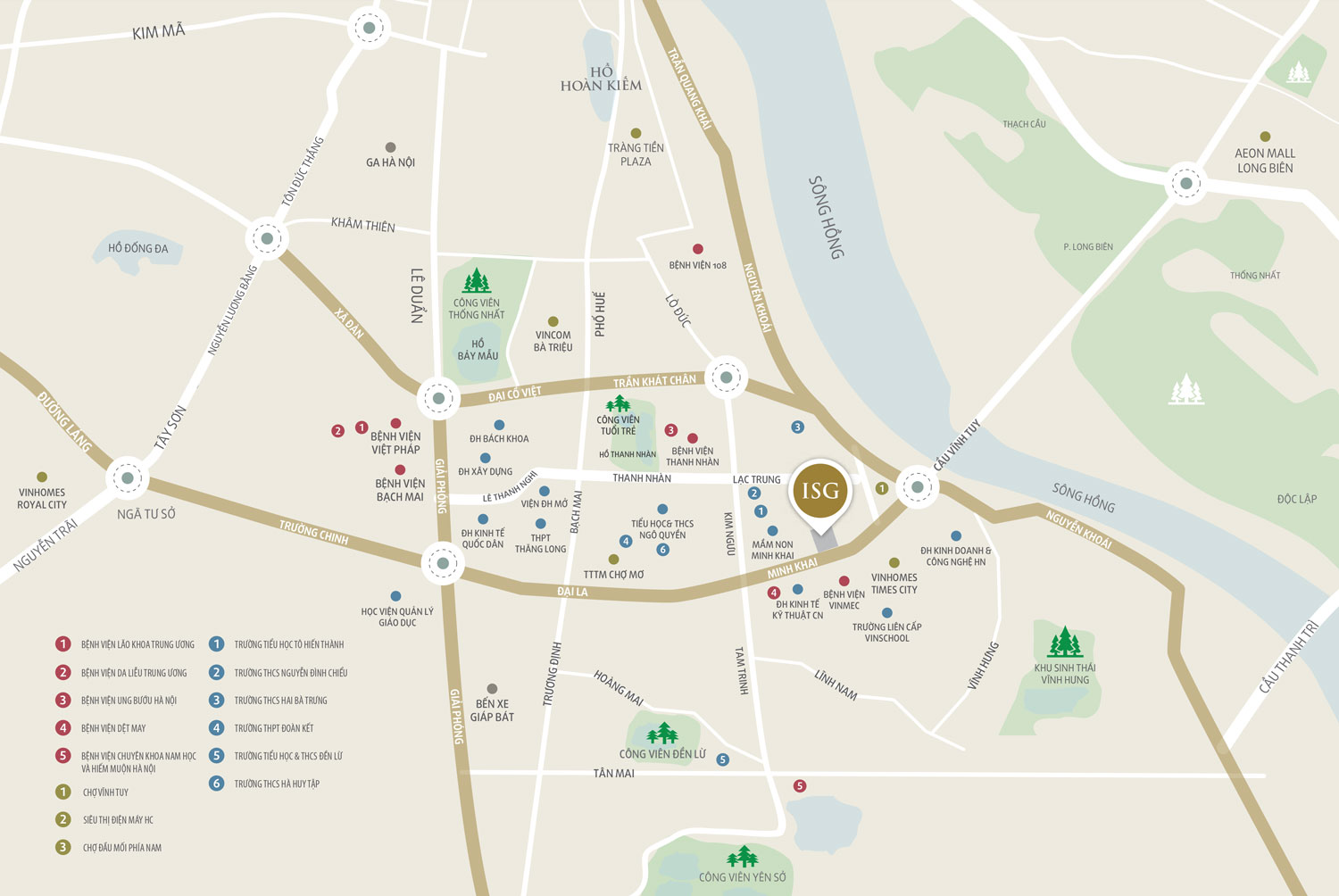 Từ Imperia Sky Garden 423 minh khai, cư dân dễ dàng di chuyển qua cầu Vĩnh Tuy để đi các tỉnh: Bắc Ninh, Bắc Giang, Lạng Sơn… Muốn về Hà Nam, Nam Định, Ninh Bình, Thanh Hóa, Nghệ An… cư dân chỉ cần mất 10 phút đi theo đường Tam Trinh, ra Cao tốc Pháp Vân – Cầu Giẽ. Hướng về Hưng Yên, Hải Dương, Hải Phòng, Quảng Ninh càng vô cùng thuận lợi bởi ngoài tuyến đường 5 cũ, cư dân chỉ mất vài phút đi qua cầu Vĩnh Tuy, ra tuyến đường Cao tốc 5B: Hà Nội – Hải Phòng.