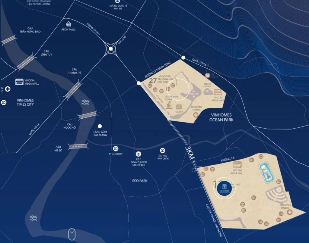 Nằm trong quy hoạch tổng thể phát triển các khu đô thị vệ tinh phí Đông và Đông Nam Thủ đô, vị trí Vinhomes Ocean Park The Empire sở hữu hệ thống giao thông đã và sẽ được xây dựng mới cực kỳ đồng bộ và hiện đại. Từ dự án, cư dân có thể dễ dàng kết nối vào trung tâm Hà Nội, các quận phía Tây Thủ đô hay các tỉnh thành lân cận.