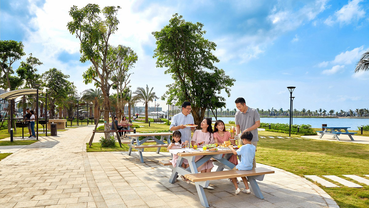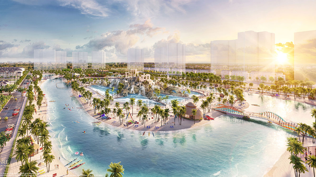 - Công viên The Wave Island với điểm nhấn Quảng trường sóng, artwort, sóng biển, bể bơi resort, vườn BBQ, sân chơi trẻ em chủ đề đại dương, đổi cảnh quan, các sân tập thể thao, …