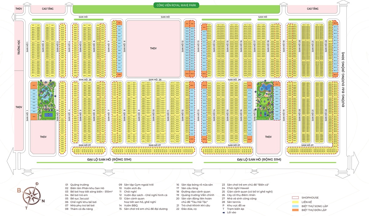 - Công viên nhiệt đới với quảng trường sân chơi nước, quảng trường nhiệt đới, artwork Rừng nhiệt đới, thảm cỏ picnic, vườn BBQ, vườn Gym nhiệt đới, các sân tập thể thao…