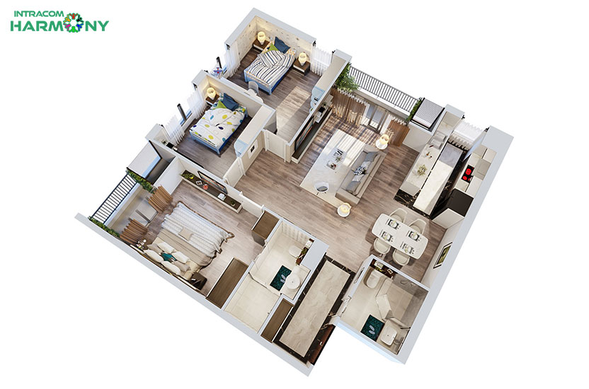 Cách bố trí căn hộ rất chú trọng vào trang trí họa tiết và nội thất tiện nghi hiện đại. Không gian các phòng được bố trí một cách hợp lý. Bạn sẽ có một không gian sống ấm cúng, quây quần bên gia đình. Thiết kế nội thất thông minh cũng sẽ tạo không gian thoáng đãng, thoải mái cho gia đình bạn và giúp tận dụng không gian căn hộ. Người dân sẽ không còn phải lo sẽ sống trong căn hộ chung cư chật hẹp, ngột ngạt. Với phong cách đơn giản, tinh tế, Intracom Harmony sẽ làm hài lòng ngay cả những khách hàng khó tính nhất.