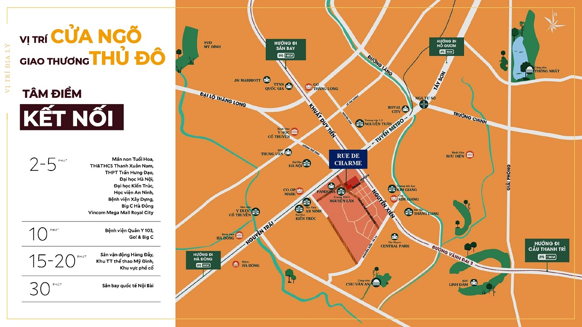 Dự án Rue De Charme kết nối với hệ thống hạ tầng chung của khu vực như đường cao tốc trên cao, đường sắt trên cao Cát Linh – Hà Đông… giúp cư dân trong tòa nhà dễ dàng đi lại theo các hướng. Dự án gần các trường đại học lớn, gần bệnh viện, siêu thị, bến xe….là các yếu tố cấu thành hệ thống hạ tầng xã hội, cư dân sẽ được đáp ứng đầy đủ các tiện ích mà không phải đi xa