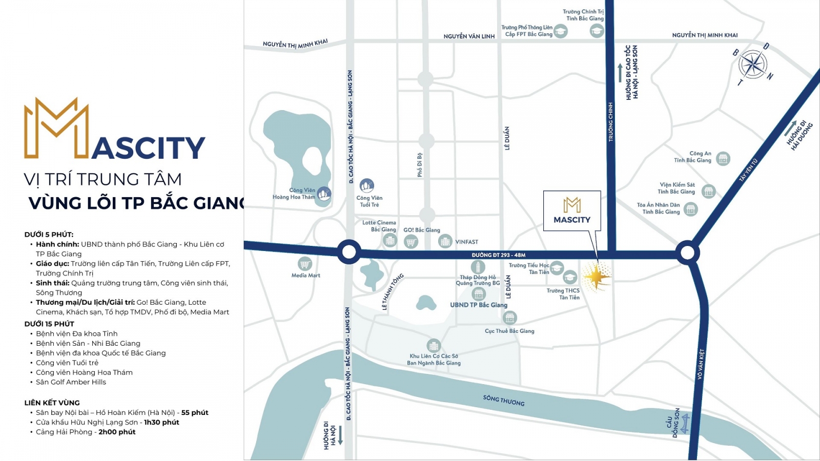 MasCity Bắc Giang có một vị trí không thể đẹp hơn, nơi kết nối giữa nội thành Bắc Giang với khu Hành chính – Thể thao – Đô thị mới trong tương lai phía bên kia đường cao tốc (thông qua hầm chui), là niềm tự hào của đô thị Bắc Giang để “khoe” với các hành khách qua lại trên đường cao tốc Hà Nội – Lạng Sơn.
