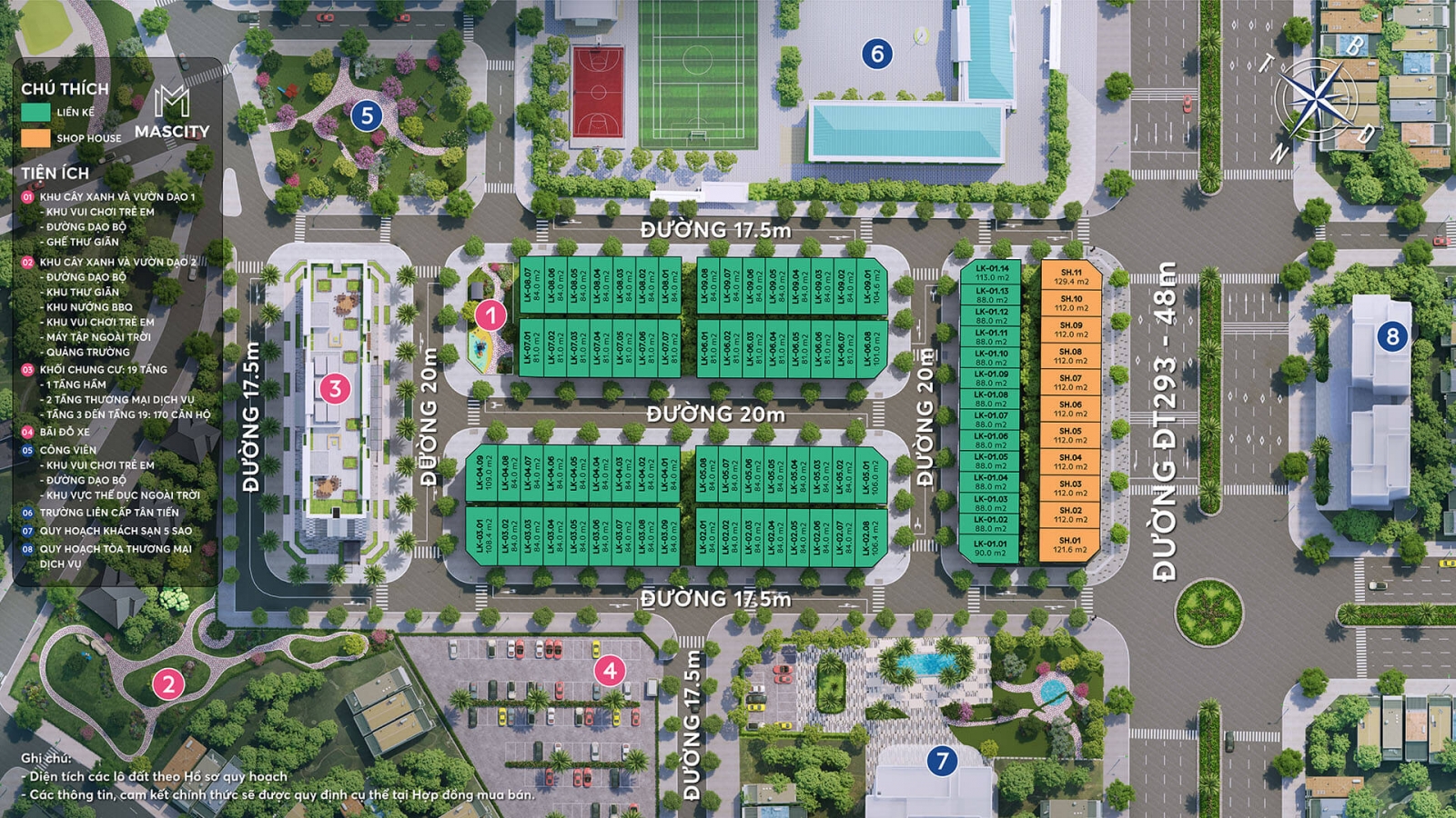 Mặt bằng Mascity Bắc Giang được bố trí tối ưu theo hướng Đông Nam – Tây Bắc là chủ đạo & không có hướng Tây chính diện vị trí khu cao tầng góp phần tạo bóng mát và tránh nóng hướng Tây cho các căn thấp tầng. Thiết kế mỗi sản phẩm Mascity đều có 02 mặt trước sau, tối ưu hiệu quả sử dụng với quy hoạch mỗi căn tối đa 07 tầng vừa phục vụ nhu cầu ở – kinh doanh & cho thuê.